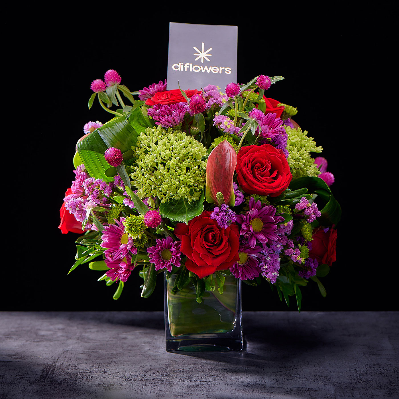 Cubo de vidrio de 10x10x10cm con 7 rosas, 3 anturios, hortensias, mix de flores y diversos follajes. Altura aprox: 35cm.
