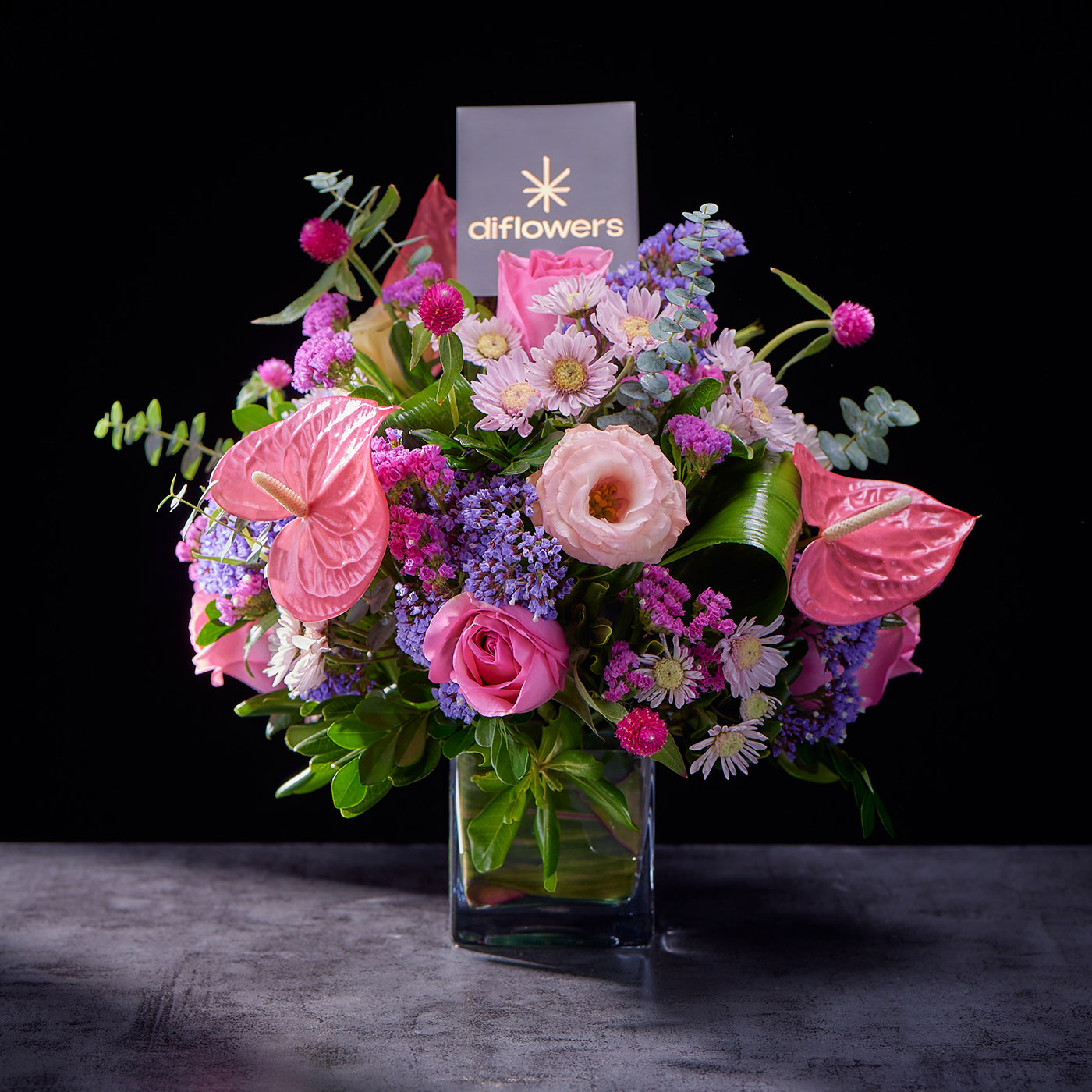 Cubo de vidrio de 10x10x10cm con 5 rosas, 3 anturios, lisianthus, mix de flores y diversos follajes. Altura aprox: 35cm.